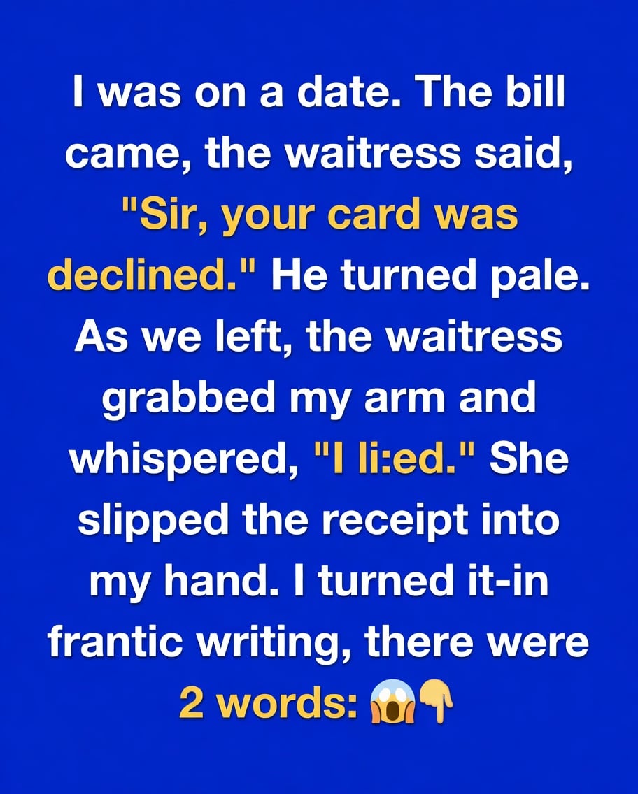 I thought it was just an awkward moment when the waitress said my date’s card had been declined. He looked embarrassed, we stepped outside, and I was ready to brush it off as one of those uncomfortable first-date mishaps. But then she followed us, grabbed my arm, and whispered, “I lied.” Before I could process it, she slipped the receipt into my hand. When I turned it over, my stomach dropped. Two words, written in a rush: Be careful.