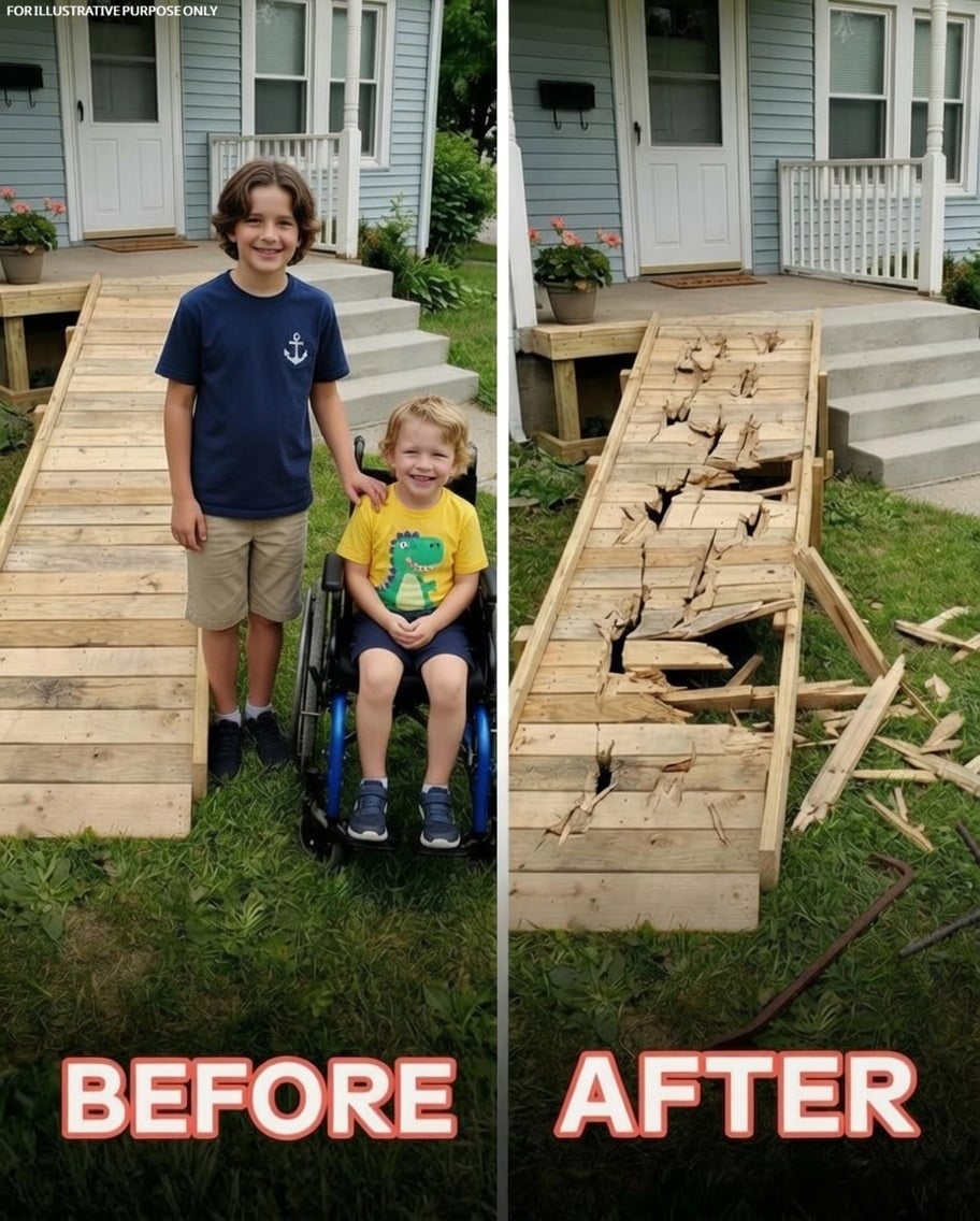 But the next morning, everything shattered. A neighbor stormed over, called the ramp an “eyesore,” and destroyed it piece by piece while the entire street watched in silence. Caleb was back at the top of those steps. Ethan blamed himself, thinking he hadn’t done enough. I told him the truth—that doing something kind always matters, even when it doesn’t last. What I didn’t know was that this wasn’t the end of the story—it was the beginning of something much bigger.