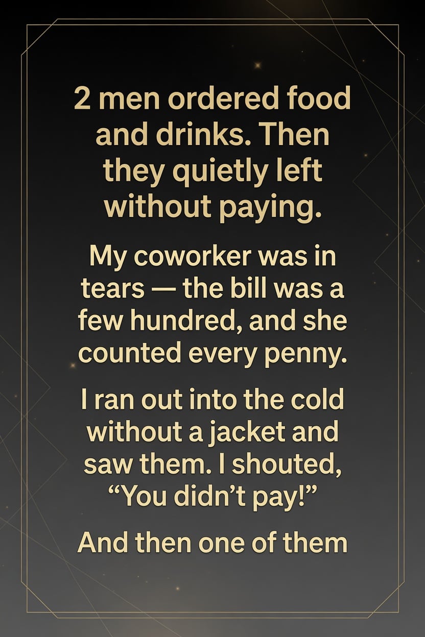 Two men came into our small café one evening, ordering a full meal and drinks, chatting politely like any other customers. Nothing about them raised suspicion—until it was time to pay, and they quietly slipped out the door. My coworker Mia stared at the unpaid bill, her eyes filling with tears. As a single mother working two jobs, she couldn’t afford to lose that kind of money. Seeing her distress, I didn’t hesitate. I ran outside into the freezing night, determined to catch them.